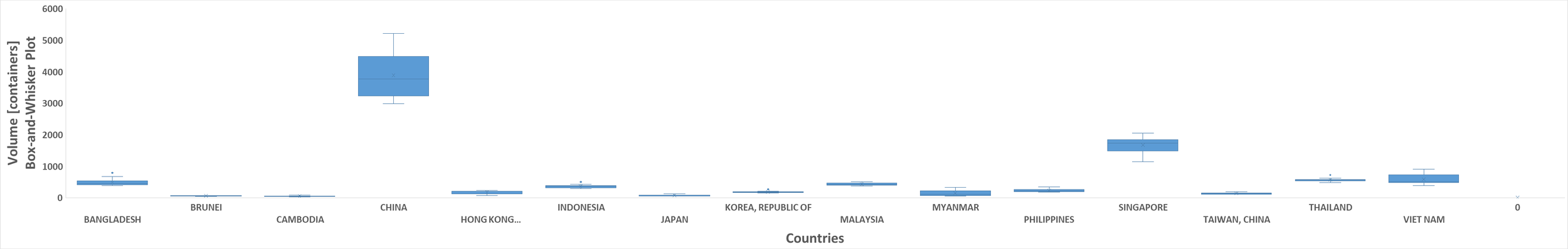 Data-Pivot-Chart-Box-Vertical > y = Volume [containers] - Statistical Box-and-Whisker > x = Countries (Asia)
