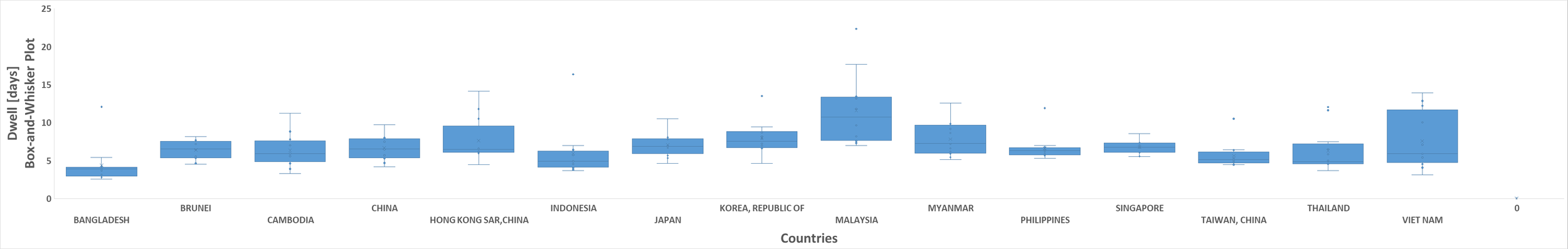 Data-Pivot-Chart-Box-Vertical > y = Dwell [days] - Statistical Box-and-Whisker > x = Countries (Asia)