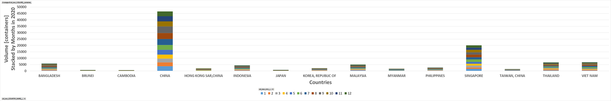 Data-Pivot-Chart-Bar-Vertical-Clustered-Stacked (by Legend) > y = Volume [containers] > x = Countries (Asia) > legend = 2020.mm