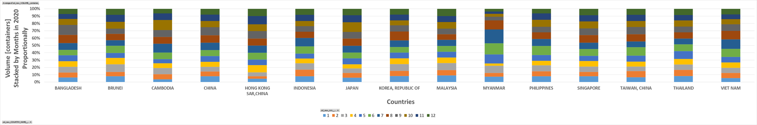 Data-Pivot-Chart-Bar-Vertical-Clustered-Stacked-Normalized (by Legend) > y = Volume [containers] > x = Countries (Asia) > legend = 2020.mm