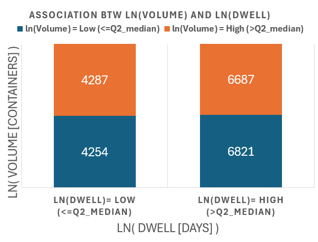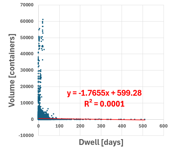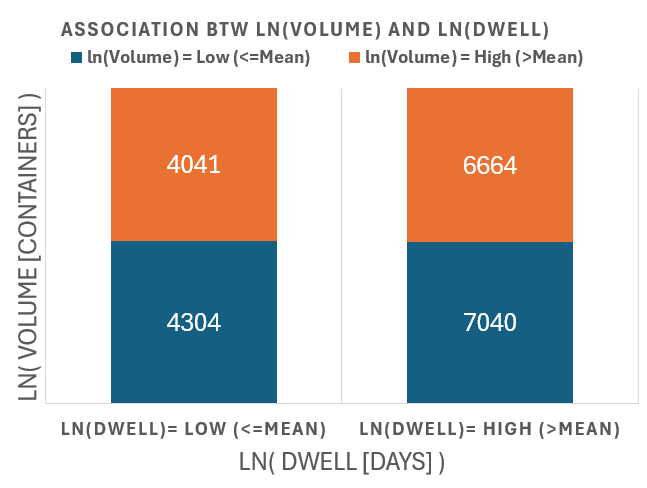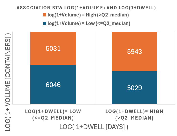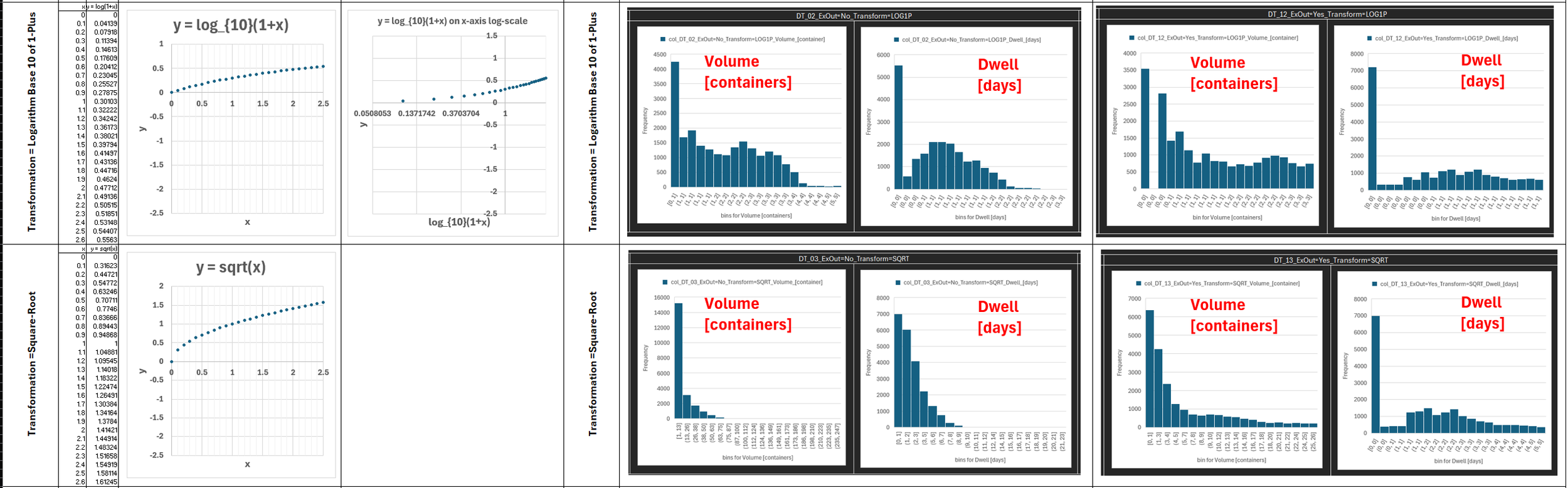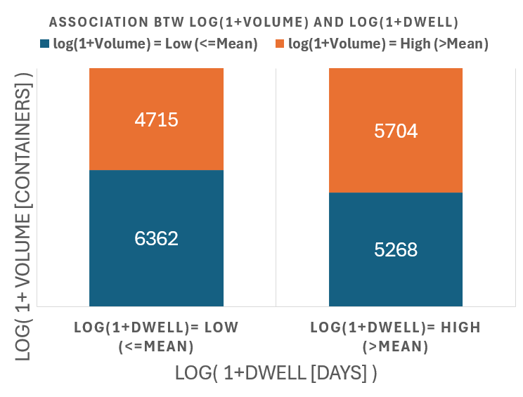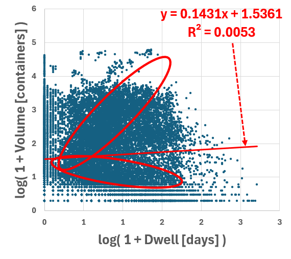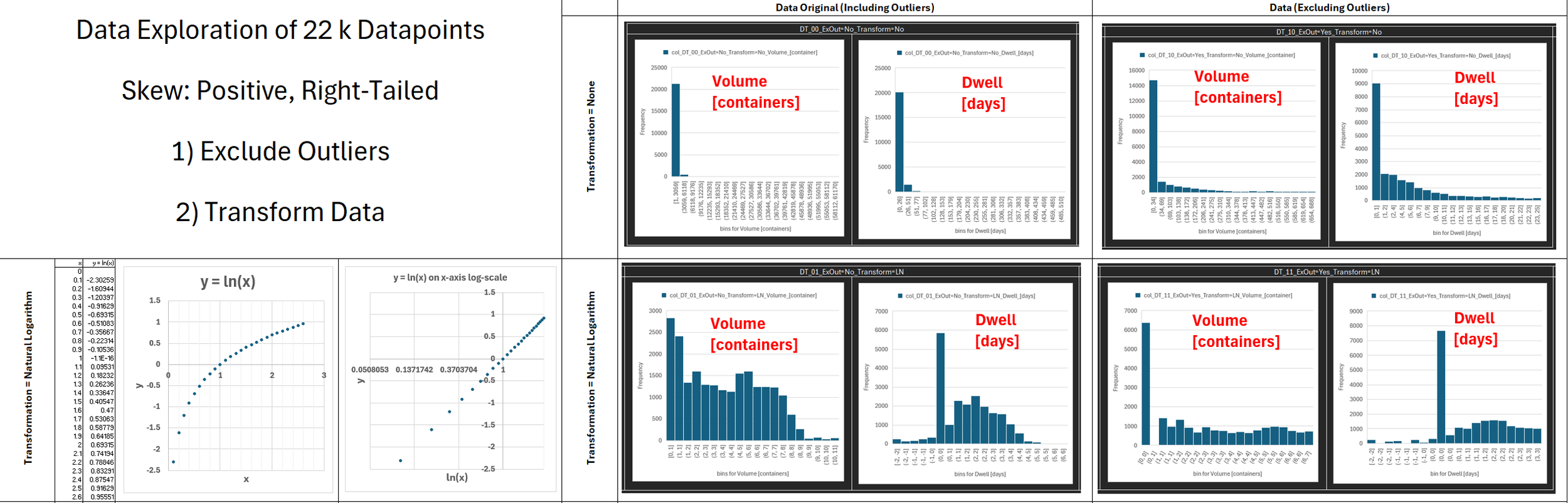 Global Container Volumes and Dwell Times in 2020 Data Period = 1 Year (2020) Data Frequency = Monthly by Continents by Countries by Movement Type Volume [containers] Dwell [days] Here we explore the entire dataset for 2020 focusing on 2 numerical factors 1) Container Volumes measured in containers 2) Container Dwell times measure in days Each datapoint is for a month, a location So the 2 numerical factors can be expressed as: 1) Volume( t=month, loc=country ) 2) Dwell( t=month, loc=country ) Both factors are clearly - all non-negative - positively skewed (long right-tail) So we try two methods to transform the data 1) Exclude Outliers 2) Logarithmic Transformation (for non-negative values) 2.1) y = ln( x ) : for data without zeros 2.2) y = log( 1 + x) : for data with zeros