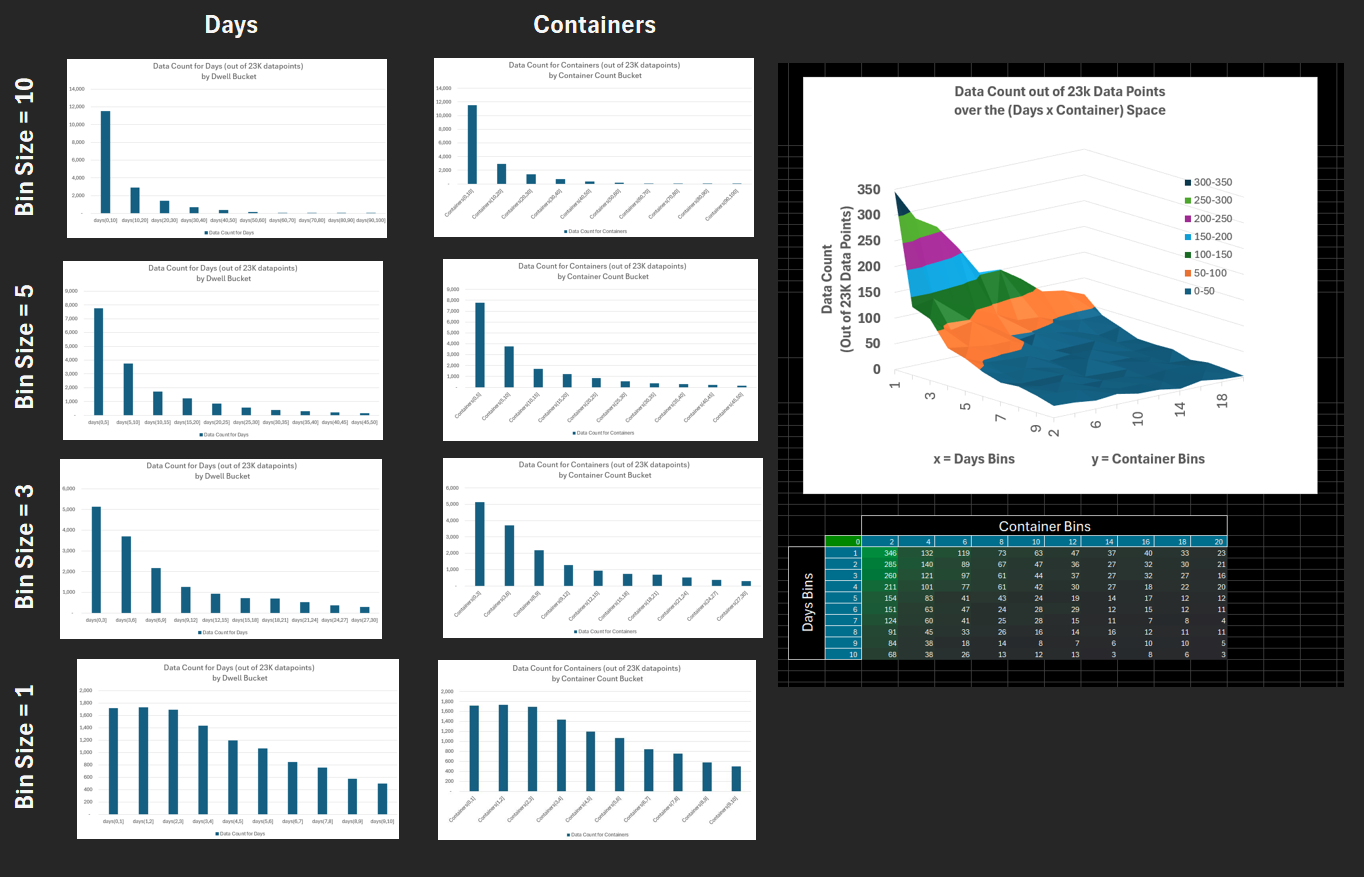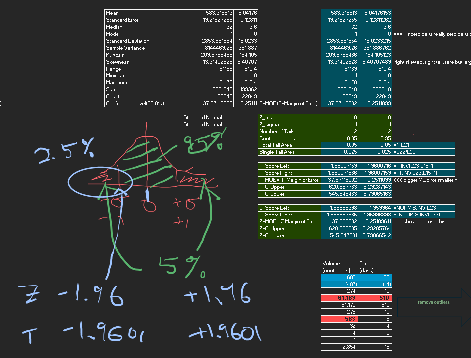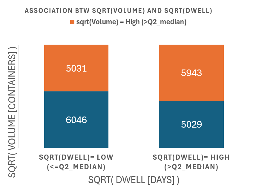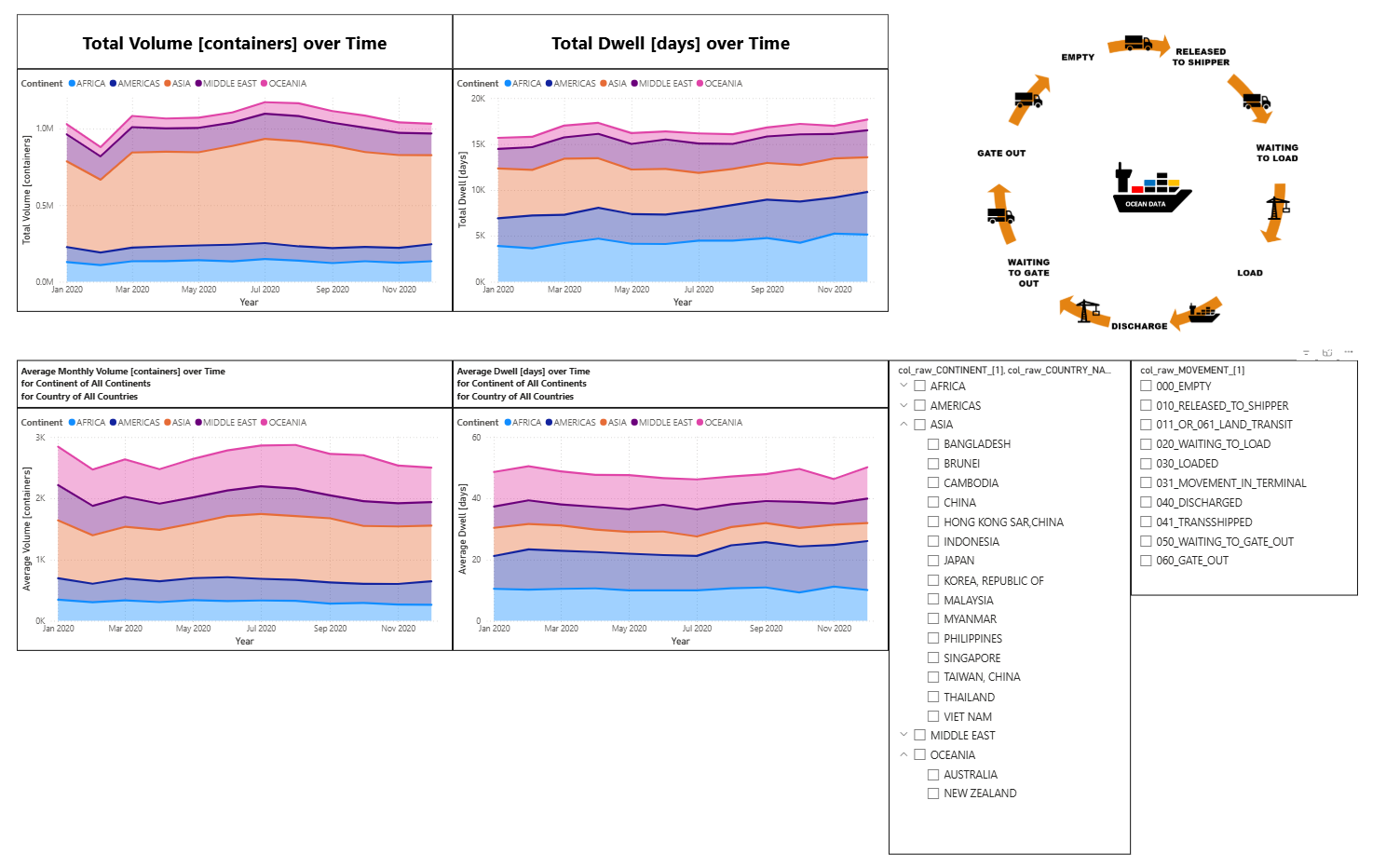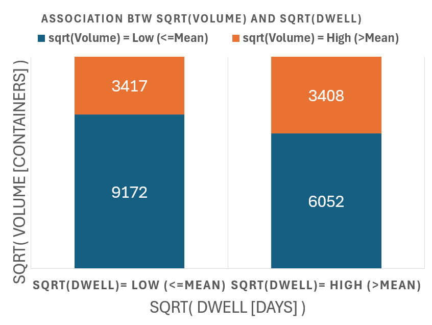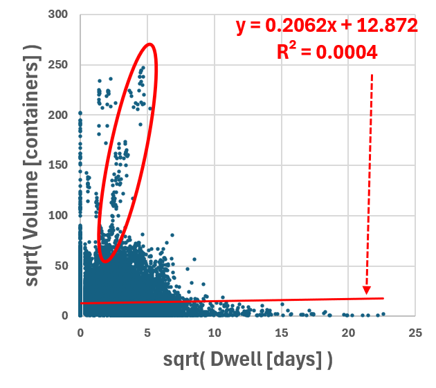 Global Container Volumes and Dwell Times in 2020 Data Period = 1 Year (2020) Data Frequency = Monthly by Continents by Countries by Movement Type Volume [containers] Dwell [days] Here we explore the entire dataset for 2020 focusing on 2 numerical factors 1) Container Volumes measured in containers 2) Container Dwell times measure in days Each datapoint is for a month, a location So the 2 numerical factors can be expressed as: 1) Volume( t=month, loc=country ) 2) Dwell( t=month, loc=country ) Both factors are clearly - all non-negative - positively skewed (long right-tail) So we try two methods to transform the data 1) Exclude Outliers 2) Logarithmic Transformation (for non-negative values) 2.1) y = ln( x ) : for data without zeros 2.2) y = log( 1 + x) : for data with zeros