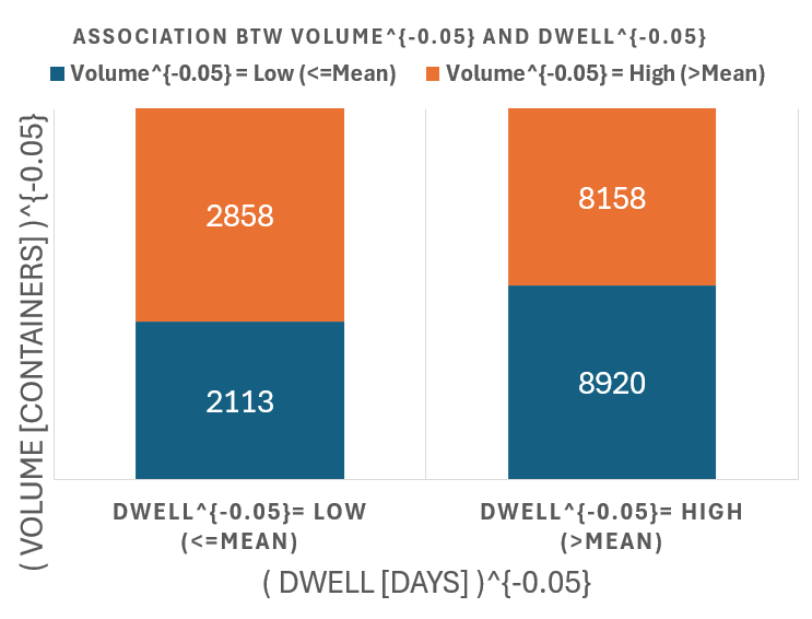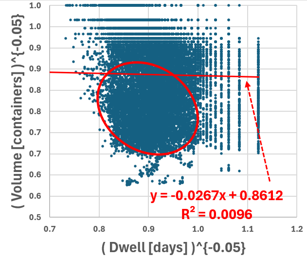 y = ( Volume [containers] )^{-0.05}