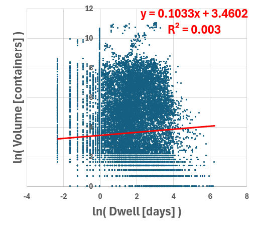 = CORREL( ln(Volume), ln(Dwell) )